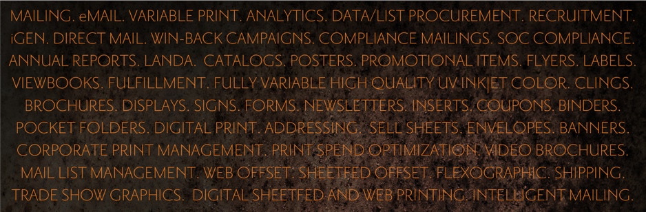 We produce: brochures, catalogs, pocket folders ,sell sheets, posters, window & floor graphics, annual reports, signs, point-of-purchase and trade show displays and much more.